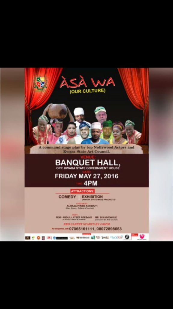 The Kwara State government has commended the corporate sponsors of the command stage play tagged ‘ASA WA’ (OUR CULTURE), organised by the Kwara state Ministry of culture and Tourism. The event will be held on Friday 27, May, 2016 at the Banquet Hall, Ilorin, the state capital.