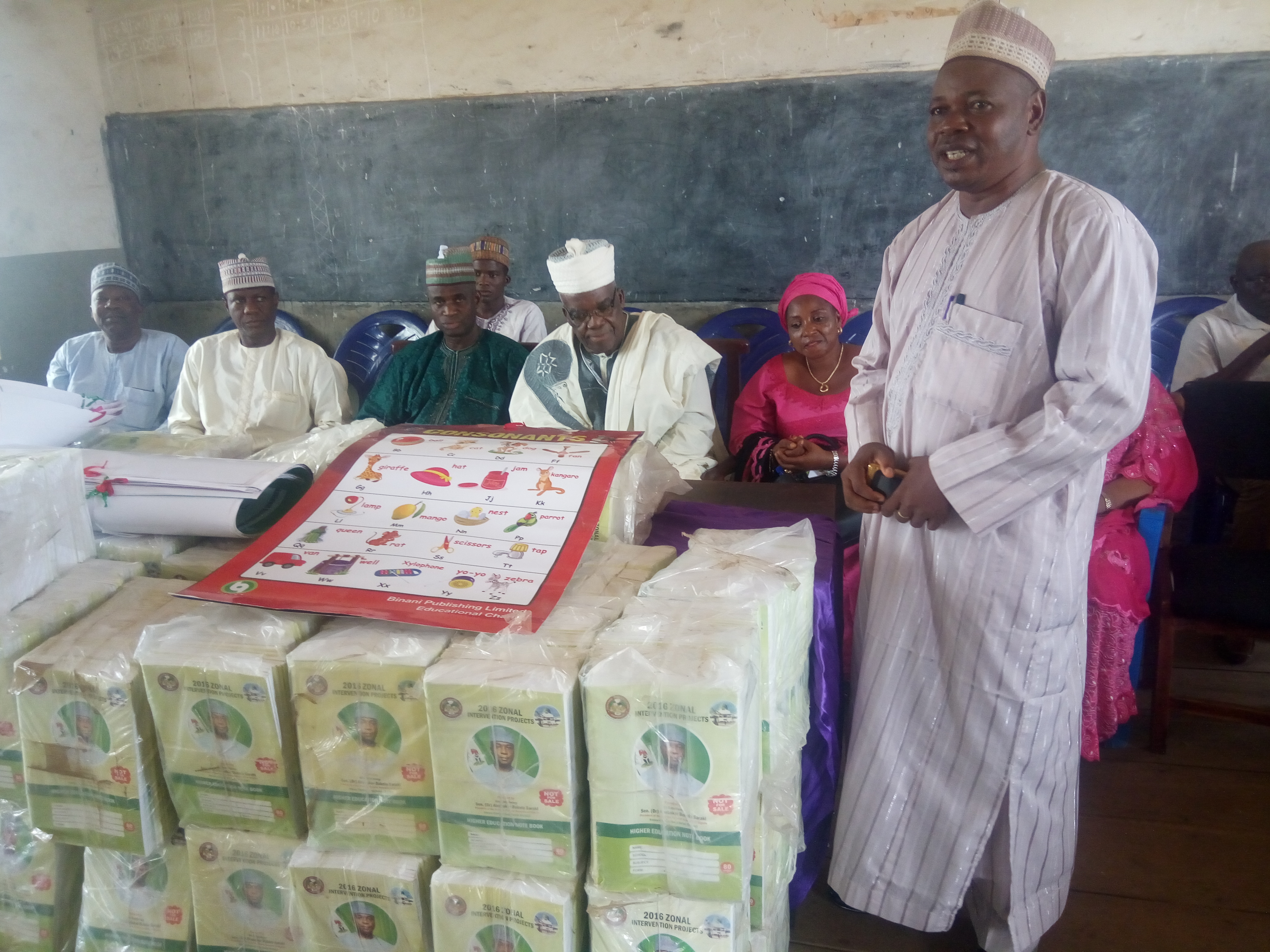 Good day my father, the first Makama of Ilorin and the PTA Chairman of Kwara state, Alhaji Ibrahim Oniye, the local government chairman of Ilorin West, Alhaji Abdulwahab Ololele, the Education Secretary of Ilorin West, Alhaji Animashaun, the APC chairman of Ilorin West, Alhaji Ballah, members of state of ABS Mandate Constituency Office, gentlemen of the press, Headmaster and pupils of Ansarul Islam LGEA School, Okemale Ilorin, distinguished ladies and gentlemen.