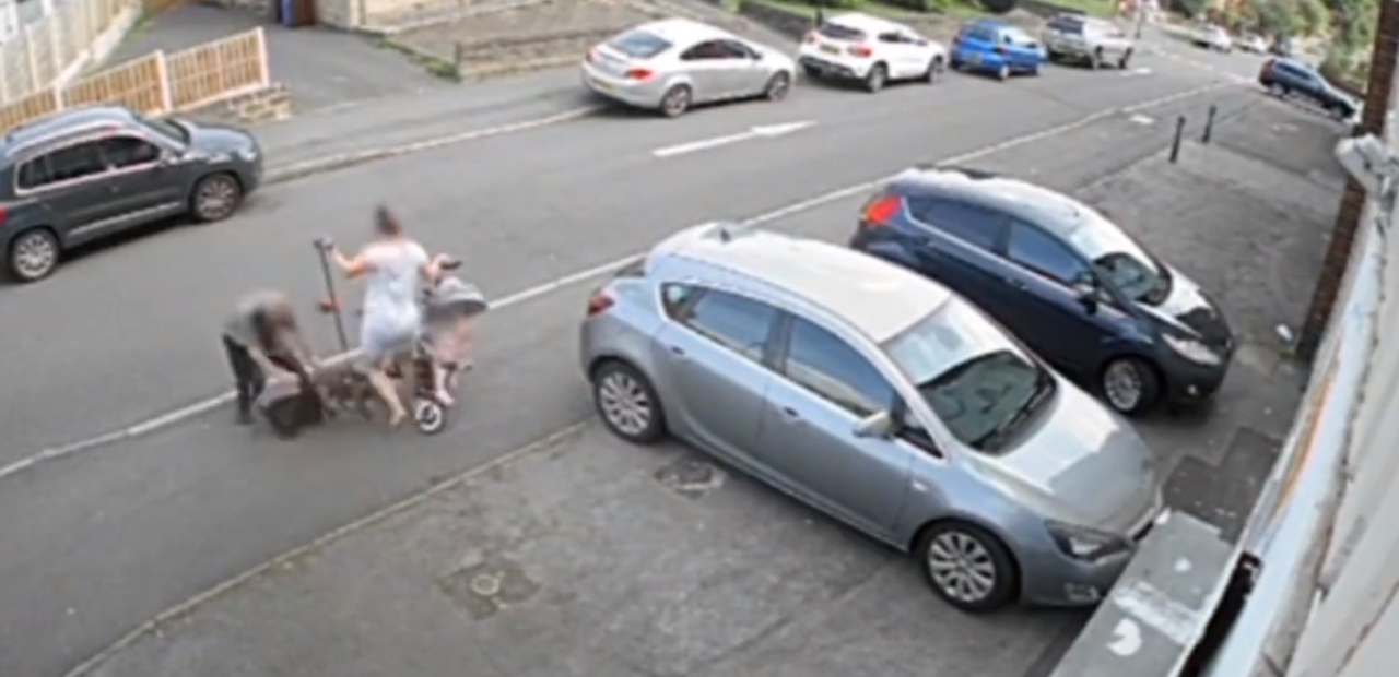 On Richmond Road in Sheffield, South Yorkshire, on September 2, the mother was walking her dog and pushing her one-year-old child in a trike when a Staffordshire bull terrier came charging up to them.