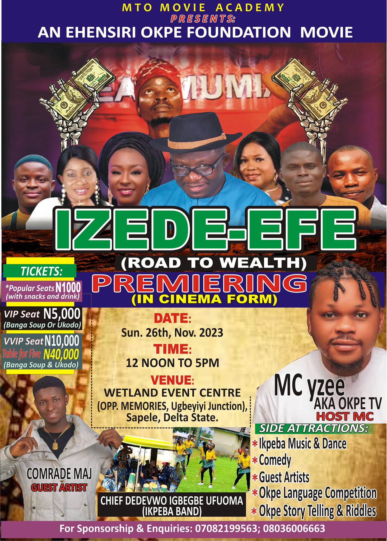 Top government functionaries, business moguls and celebrities will on Sunday, November 26, 2023, view the first-ever screenings of Okpe Language movie, Izede Efe.